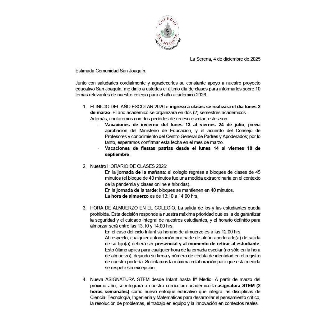 Colegio San Joaquín defines itself as a family school where all concerned, students, families and school staff are close together, communicate and know each other by our names. This allows for a strategic alliance between the school and its families where a respectful, affectionate and close bonding emerges so as to guarantee a safe and sound environment that promotes a personal and academic education of excellence throughout the entire school years.