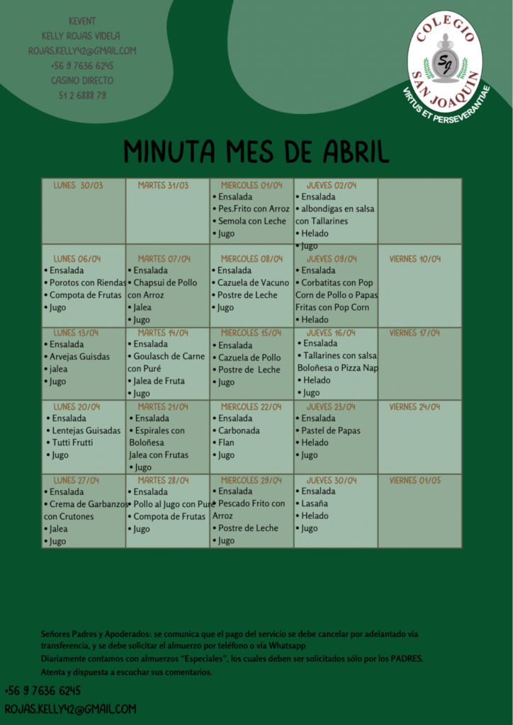 MINUTA CASINO Para cualquier consulta sobre el menú del casino, puedes comunicarte con: KELLY ROJAS VIDELA (Encargada del Casino).Correo Electrónico: rojas.kelly42@gmail.comTeléfono de Contacto: +56 9 7636 6245Teléfono de Contacto Casino Directo: +51 2 6888 79